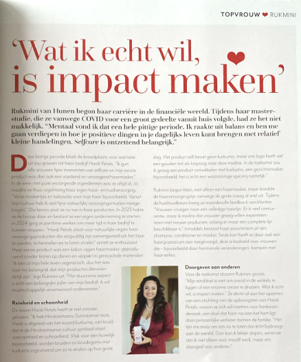 De naam Hardi Petals heeft ze niet zomaar gekozen. “Ik heb Hindoestaans-Surinaamse roots. Hardi is afgeleid van het woord kurkuma, een kruid dat in de Hindoestaanse cultuur symbool staat voor reinheid en schoonheid. Vlak voor een huwelijk bijvoorbeeld, worden bruiden en bruidegoms met kurkuma ingesmeerd om zo te stralen op hun grote dag. Het product zelf bevat geen kurkuma, maar ons logo heeft wel een gouden tint als knipoog naar deze traditie.